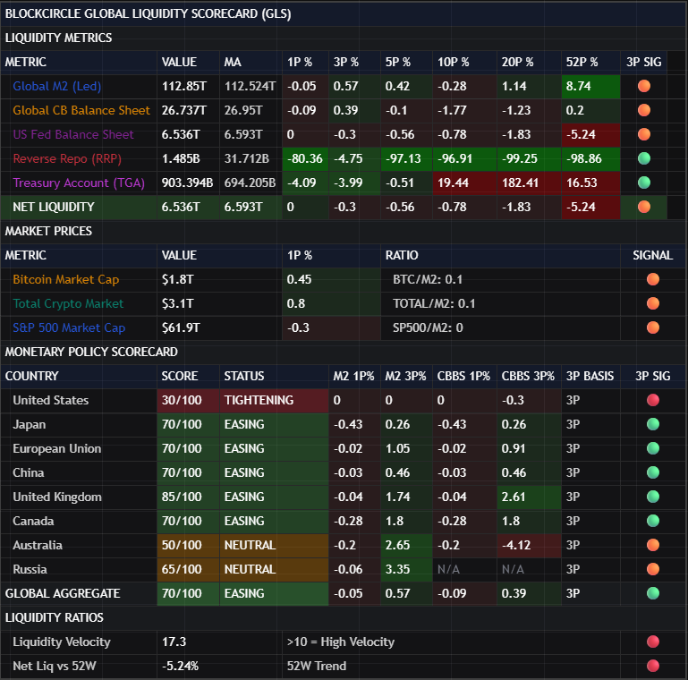 The Global Liquidity Scorecard tracks Fed, ECB, BOJ, PBOC, and BOE balance sheets — minus the Treasury General Account and Reverse Repo facility — converted to USD.