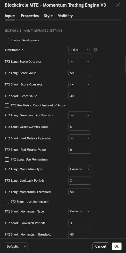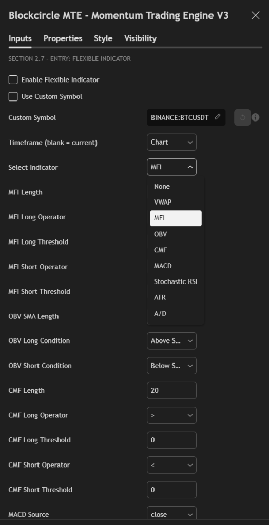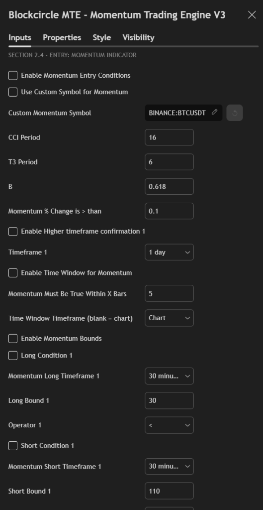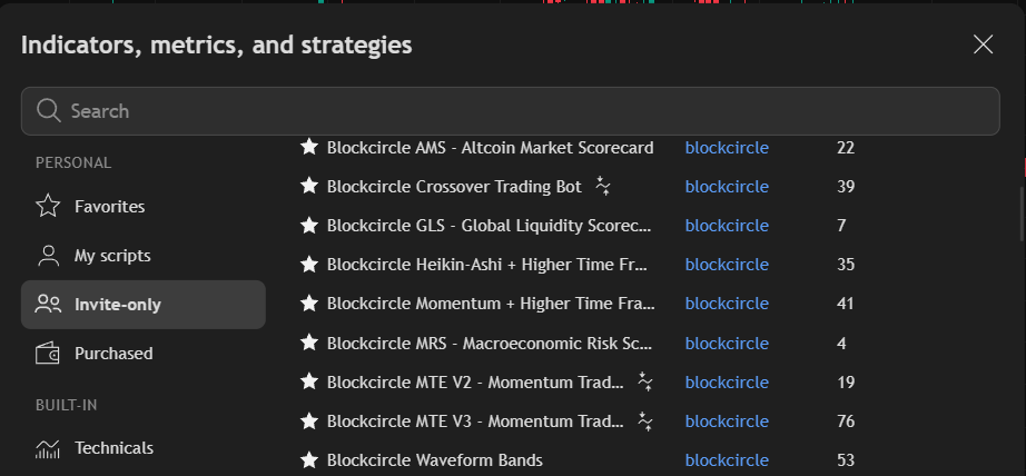 - Adding MTE V3 to Your Chart Click the “Indicators” button (looks like ƒx) at the top of your chart. In the search window that appears, navigate to the “Invite-Only” tab. You should see “Blockcircle MTE V3 – Momentum Trading Engine” if your account has been granted access. Click on it once to add it to your chart.