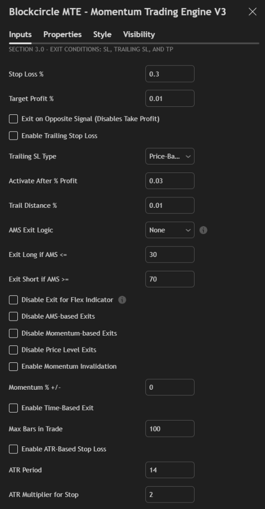 Momentum Invalidation Exits if momentum reverses by specified percentage. Catches trend changes early. Set to 0 to disable.