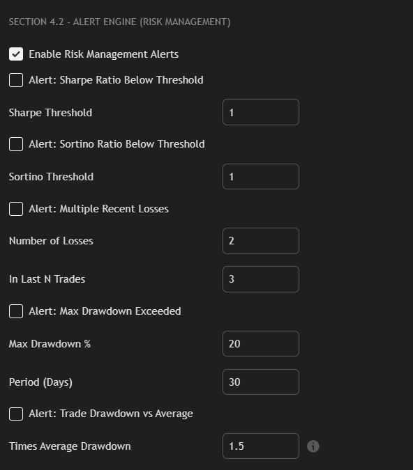 Trade Drawdown Alert Compares current trade’s drawdown to average. Multiplier of 2X means alert when current trade draws down twice the typical amount. Identifies problematic trades early.