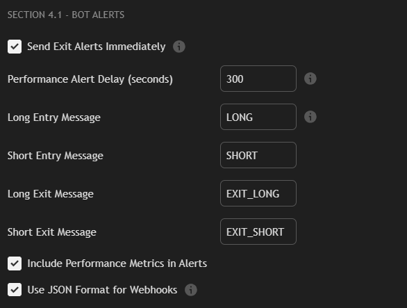 Performance Alert Delay: Waits specified seconds before sending performance metrics, allowing TradingView to calculate statistics.