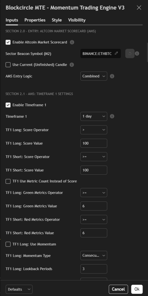 Enable Altcoin Market Scorecard Master switch for the entire AMS system. When enabled, the strategy considers overall market conditions before entering trades. This helps avoid fighting the broader market trend.