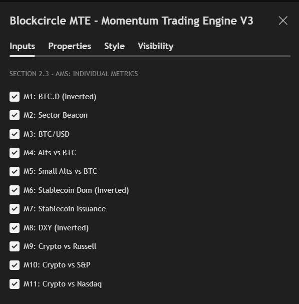 Each metric can be individually enabled/disabled to customize your market analysis: